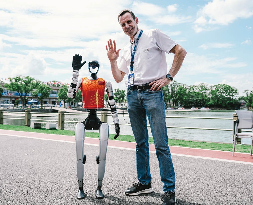 9月25日,2025赛艇世锦赛现场,世界赛艇联合会主席让·克里斯托夫·罗兰与智能机器人“艇艇”在一起。摄影/李铭珅