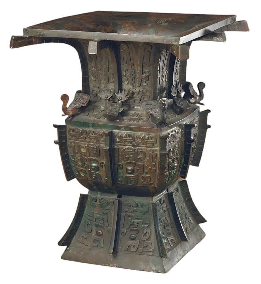 这是一件清宫旧藏,原藏颐和园。樽是盛酒器,流行于商早期至春秋战国时期。方形尊的规格很高,作为考古发掘品主要见于商代中期至西周早期的大墓和窖藏中。传世的“亚醜”铭器物主要出土于清代,多见于清宫的收藏,器型包括鼎、簋、尊、卣、彝、罍等。此件高45.5cm,宽38cm,口径33.6×33.4cm,重21.5kg。方形,侈口,鼓腹带扉棱,方足。肩四角饰四圆雕象首,象间为兽头。颈饰夔纹,腹、足饰夔纹和兽面纹,皆以云雷纹填地。器内壁近口处有铭文2行9字:“亚醜/者㚸(姒)以大子尊彝”,铭文大意:“亚醜”中一位嫁自“诸”族的年长女性铸作此器,以祭祀去世的太子(本族首领的长子)。1965—1966年,苏埠屯发现了带有四条墓道及亚字形椁室的商王级别大墓,出土了带有“亚醜”铭的大铜钺。可知亚醜族势力强大,主要活动于今青州一带,并与商王室保持着密切的联系。根据铭文字数由少到多以及河南安阳出土的同时代器物为参考,可判断此器物出现于商晚期。