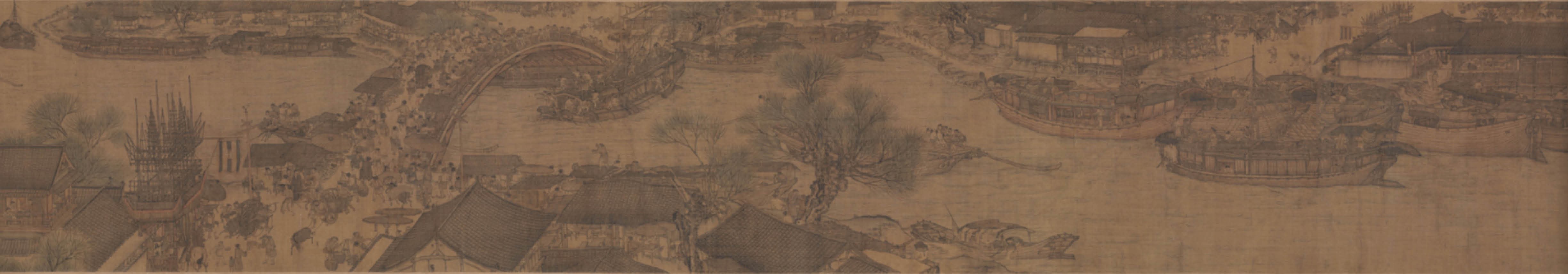 画卷首段写市郊景色,茅檐低伏,阡陌纵横,其间人物往来。中段以“上土桥”为中心,另画汴河及两岸风光。中间那座规模宏敞、状如飞虹的木结构桥梁,概称“虹桥”,正名“上土桥”,为水陆交通的汇合点。桥上车马来往如梭,商贩密集,行人熙攘。桥下一艘漕船正放倒桅杆欲穿过桥孔,艄工们的紧张工作吸引了许多群众围观。后段描写的是市区街道,城内商店鳞次栉比,大店门首还扎结着彩楼欢门,小店铺只是一个敞棚。此外还有公廨寺观等。街上行人摩肩接踵,车马轿驼络绎不绝。