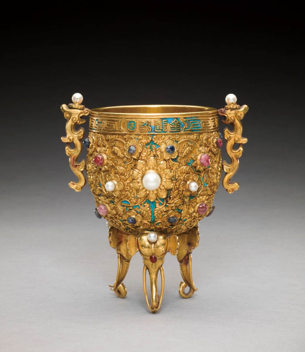 在故宫博物院中,皇家的尊贵与奢华渗透在宫廷生活的随时随处,无论是日用的器具,饮撰用具,还是陈设器物,无一不是造型复杂,用料贵重,制作考究。金瓯永固杯是清宫礼制用器,黄金质地,极为珍贵。此杯金质,鼎式,圆形,直口。口沿錾回纹一周,一面中部錾篆书“金瓯永固”,一面錾“乾隆年制”四字款。外壁满錾宝相花,花蕊以珍珠及红、蓝宝石为主。两侧各有一变形龙耳,龙头上有珠。三足皆为象首式,象耳略小,长牙卷鼻,额顶及双目间亦嵌珠宝。