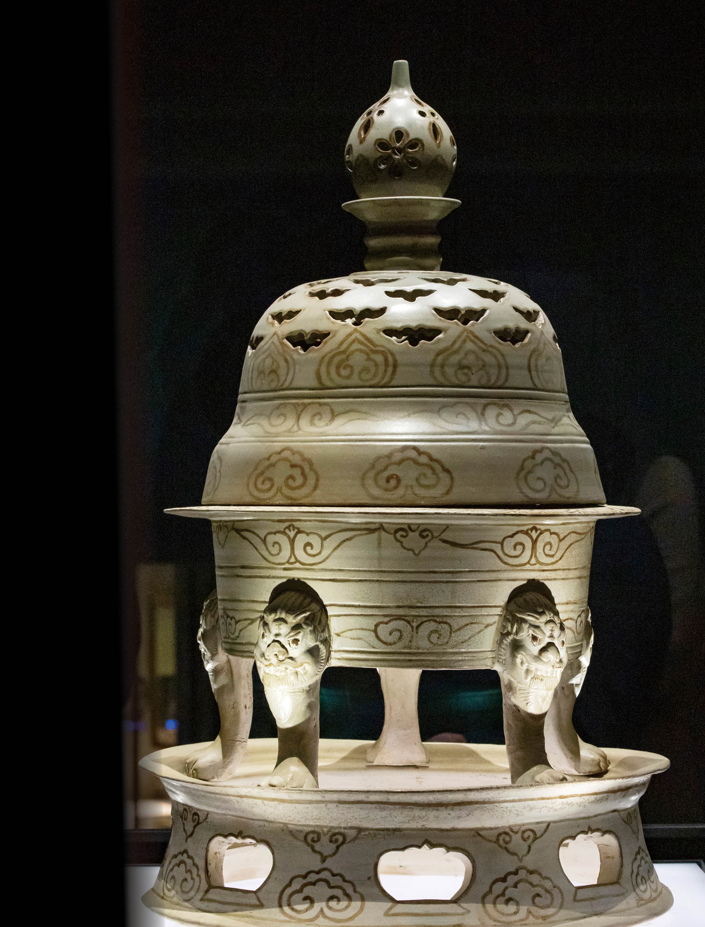 在杭州的吴越文化博物馆里,有三件“必看”的“国宝级文物”,它们分别是秘色瓷褐彩云纹熏炉、秘色瓷褐彩云纹盖罂和秘色瓷褐彩云纹油灯,均出土于吴越王钱镠的母亲水丘氏墓,都是秘色瓷的巅峰之作。