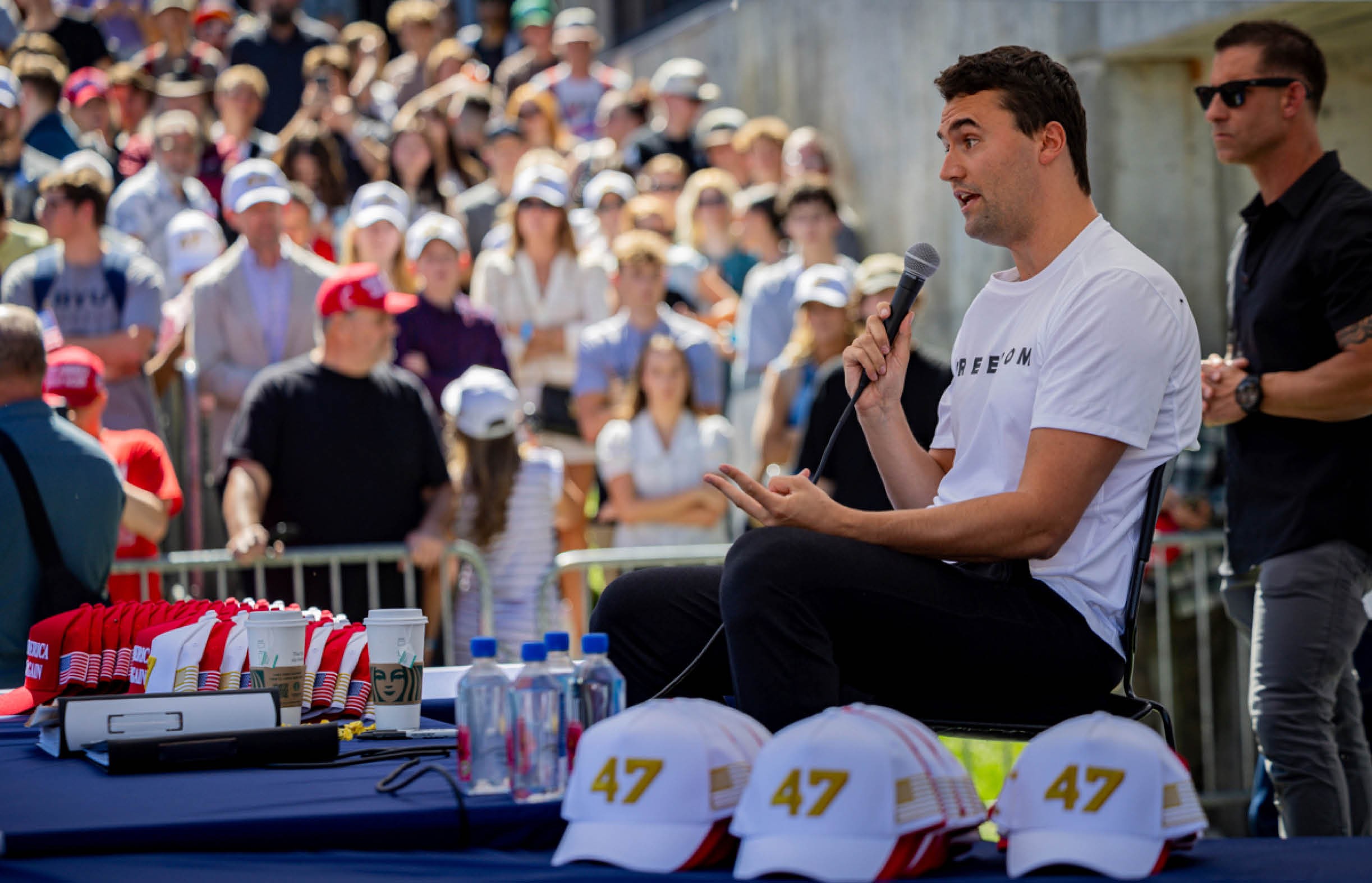 上图:9月10日查理·柯克在美国犹他州奥勒姆市的犹他山谷大学遭枪击前发表演讲。