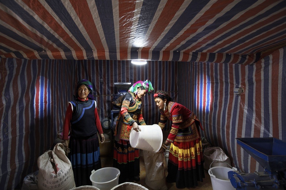 2018年10月17日,凉山州金阳县热柯觉乡东风村。村民们在加工荞麦粉。