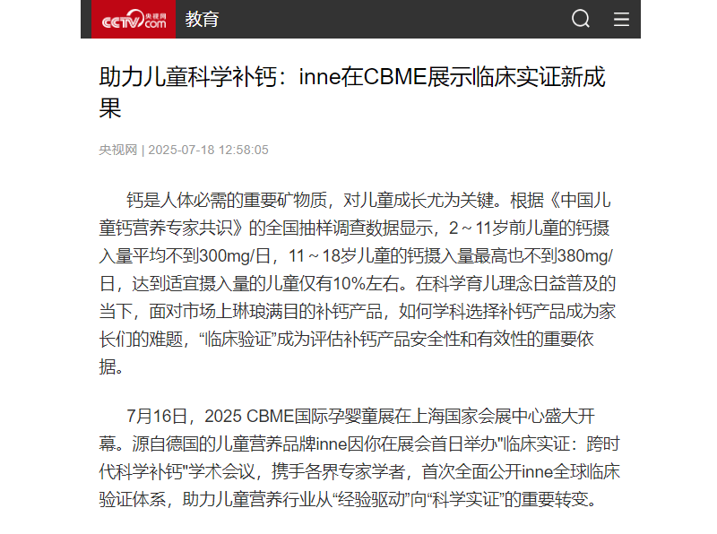 近日,源自德国的儿童营养品牌inne因你连续第三年亮相CBME国际孕婴童展。展会首日,品牌携手央视网共同举办“临床实证:跨时代科学补钙”学术会议,首次提出以临床研究为基础的“科学选钙金标准”,开创行业先河,引发广泛关注。此次会议不仅标志着儿童营养品选钙标准迈向科学化、规范化的新阶段,也进一步展现了inne坚持以临床证据为核心、守护儿童健康成长的品牌使命。活动获得央视网、新华网等多家权威媒体的深度报道,成为本届展会备受瞩目的行业焦点。