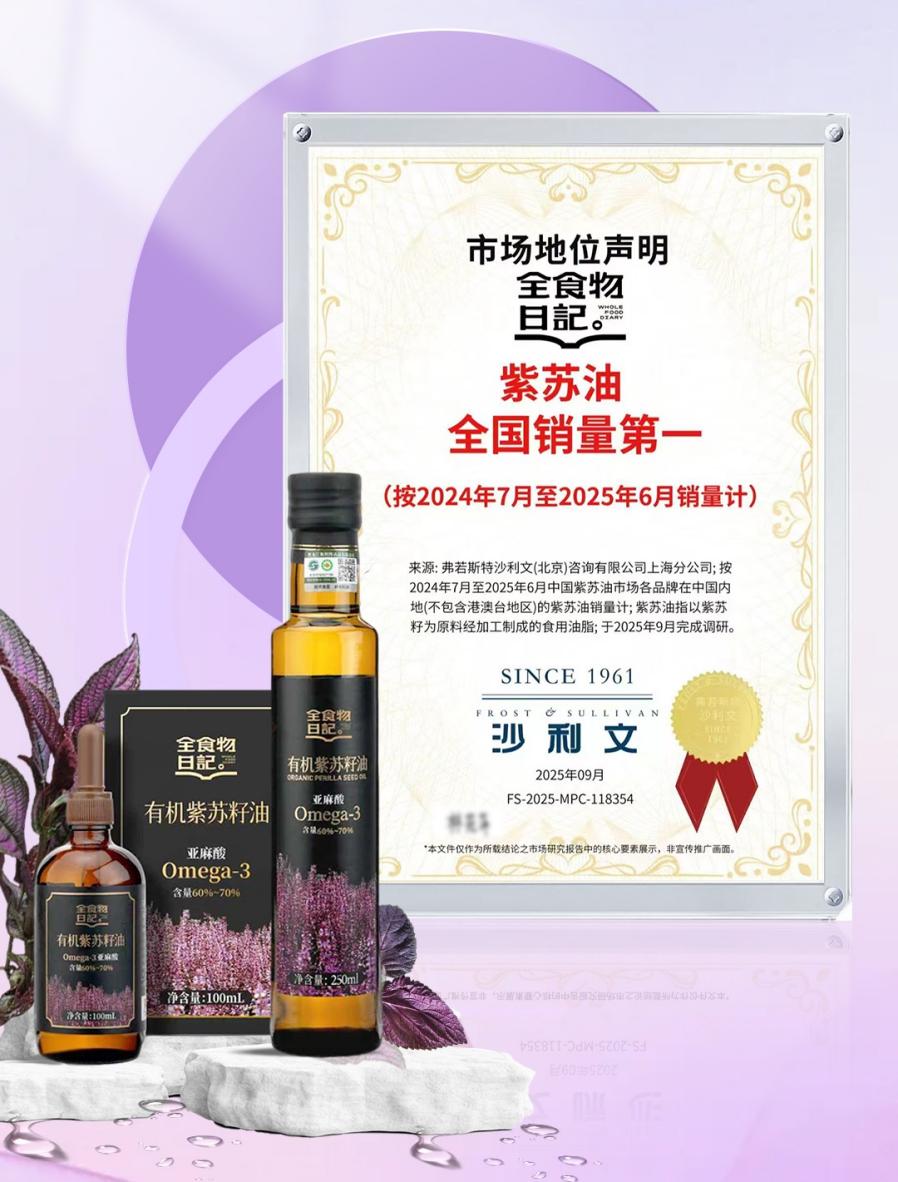 2025年9月,全球企业增长咨询机构弗若斯特沙利文(Frost & Sullivan,简称“沙利文”)授予全食物日记“紫苏油全国销量第一”认证,确立了其在中国紫苏油市场的绝对领导地位。