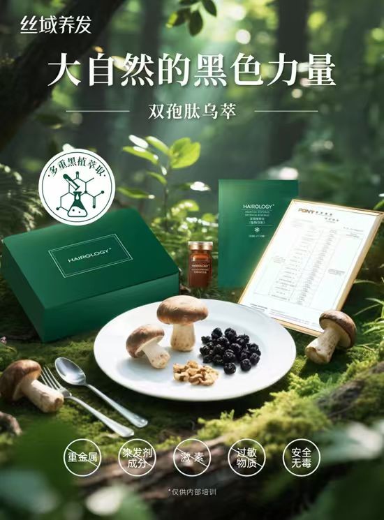 在产品创新方面,丝域手握三大技术壁垒型全球首创单品(酵能染发剂、头皮水光针、纳米包裹技术产品),已自主研发出超过200款产品,涵盖洗发水、洗发泥、头皮清洁乳、护发素、发膜、头皮精华液、护发精油等,创新品类远超行业平均水平。此外,丝域敏锐洞察养发行业发展变化,经科学论证后勇于开展前沿创新,发力探索 “妆食同源” 新风向,成功推出 “食用菌黑发双孢肽产品”。该产品作用机理不同于市场上现有任何染发产品,不含化学染色物质、氨水等碱性成分及双氧水等强氧化剂,相关技术已获得三项中国授权发明专利。