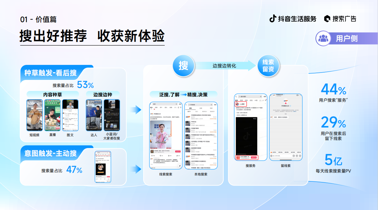 ● 为线索商家开启更多流量入口,用户「主动搜」触发的搜索量占比47%,种草场景下触发用户「看后搜」的搜索量占比53%。