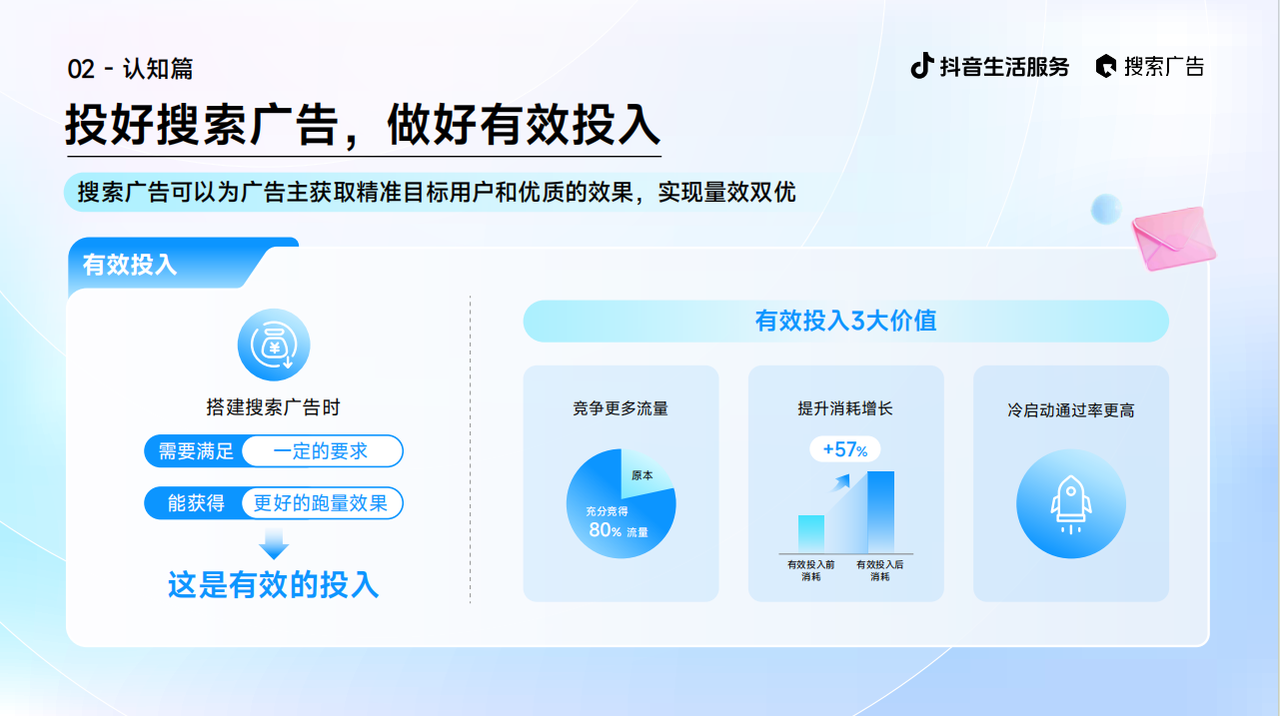 ● 价值二是更多优质线索:「看后搜」与「主动搜」形成双轮驱动,同质客户下,抖音的搜索广告相较于非搜索广告,线索有效性提升27%,重点线索行业整体流量增长10%,如汽车、教育、商务服务、家具建材、本地服务、金融业等搜索流量增势迅猛。
