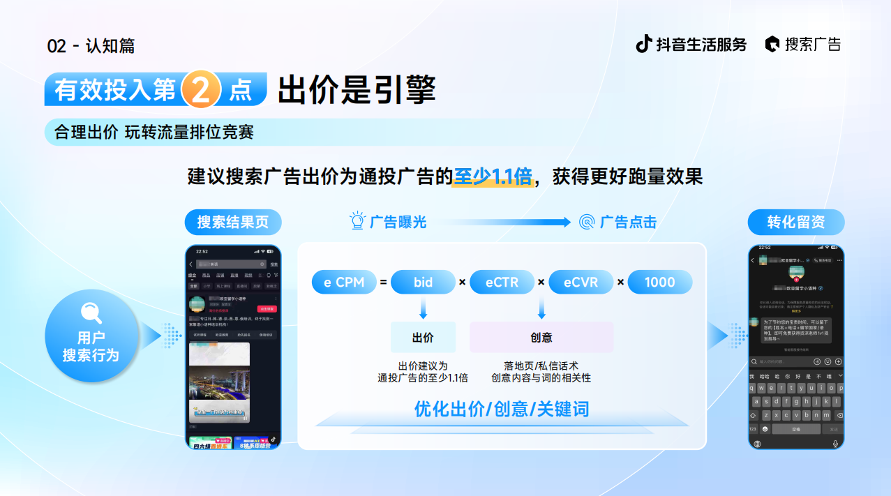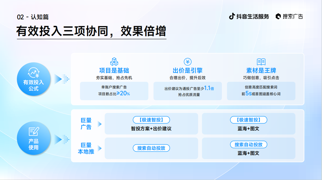有效投入的核心公式,即「搜索有效投入= 项目优势+出价优势+素材优势」,项目、出价、素材三者协同发力,才能实现线索获客效果倍增。