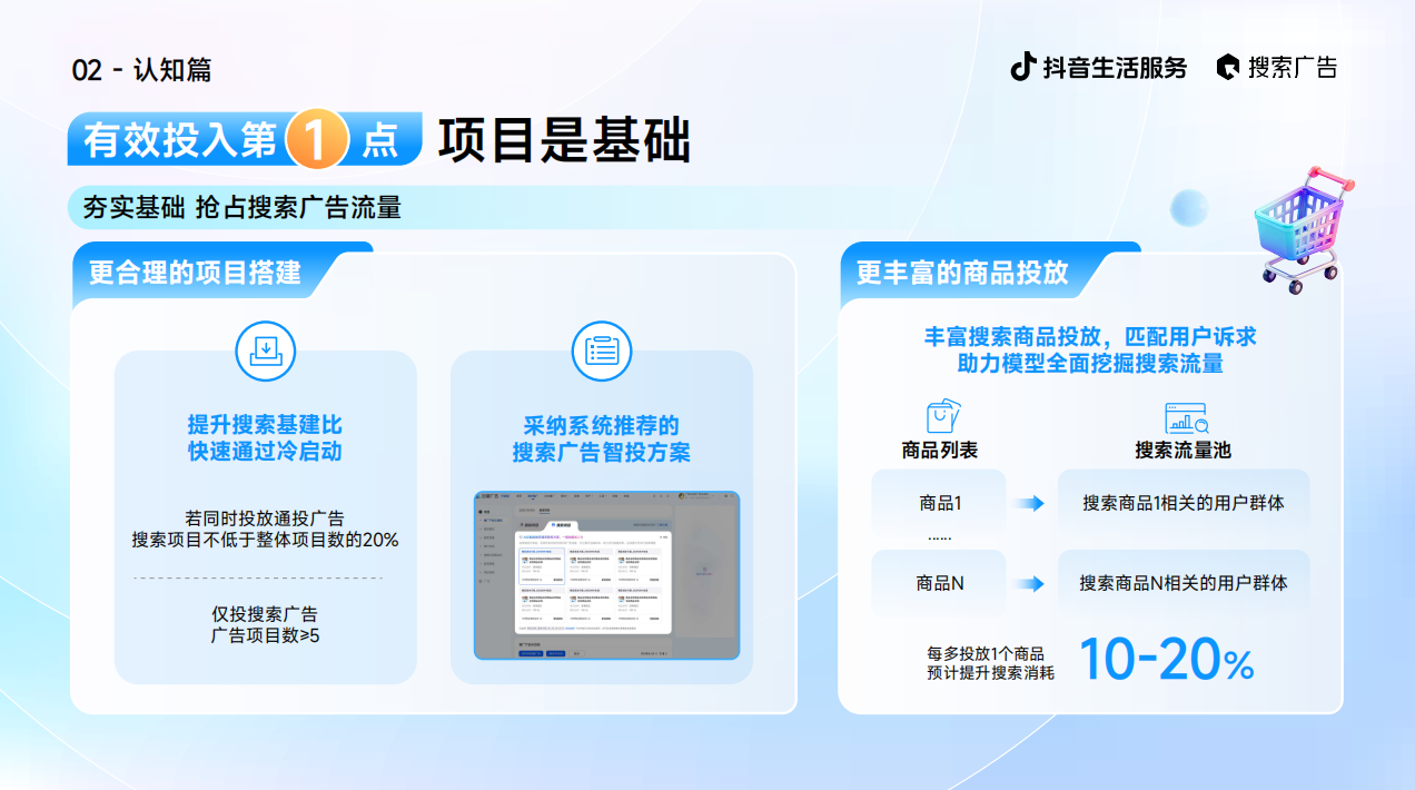 项目是基础,商家需夯实基建以扩大流量覆盖。合理的项目数量配置,以及丰富的商品投放,是帮助商家开启高效投放的第一步。