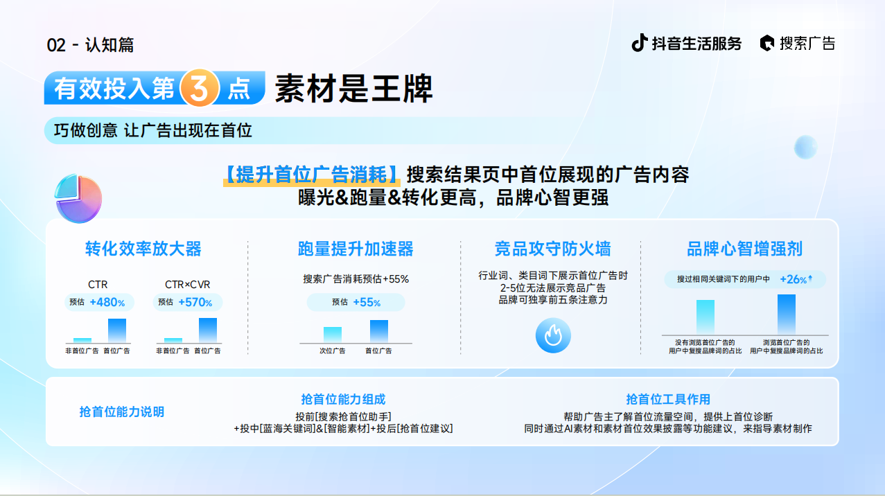 素材是王牌,商家需巧做创意以抢占先机。首位广告的价值远超非首位广告,行业词、类目词下的首位广告可「屏蔽」2-5 位竞品广告,独享用户注意力,强化品牌心智。商家需两步发力:一是匹配「蓝海关键词」,二是运用「图文广告」。