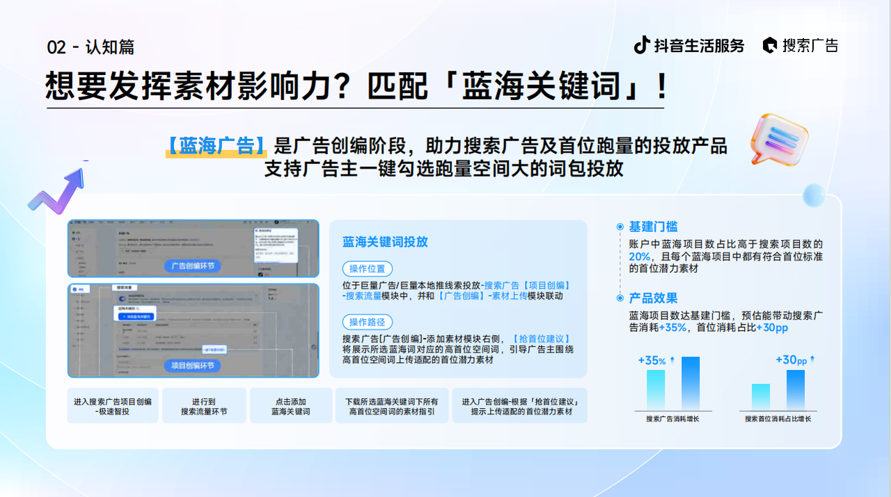 其一,匹配「蓝海关键词」:巨量广告/巨量本地推为商家提供的「蓝海关键词」功能,可以一键勾选跑量空间大的词包的功能,并围绕高首位空间词上传适配素材。当蓝海项目数达到基建门槛,预估带动搜索广告消耗增长35%、搜索首位消耗占比提升30个百分点。