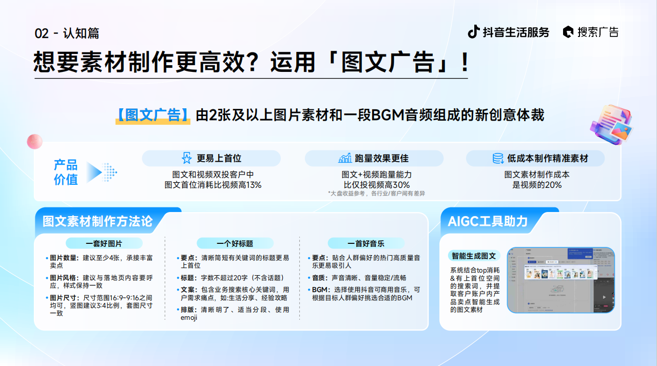 其二,运用 「图文广告」:这种由两张及以上图片与一段 BGM 组成的创意体裁,制作成本更低且跑量效果更佳。广告主结合制作方法论,即「风格一致的图片+含核心关键词的标题+贴合人群偏好的BGM」,更易实现首位突破,更可选择AIGC工具,助力商家智能生成图文素材。