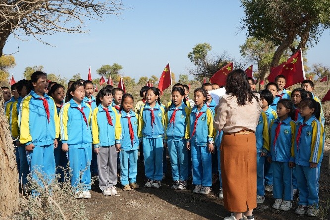 图4 小学生们正在跟着教师诵读“胡杨精神”(李小虎 摄)
