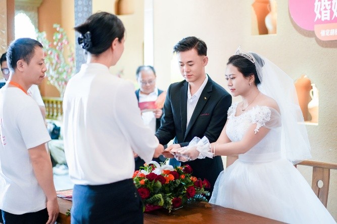 图7 正在“胡杨林主题婚姻登记处”登记的新人(李小虎 摄)