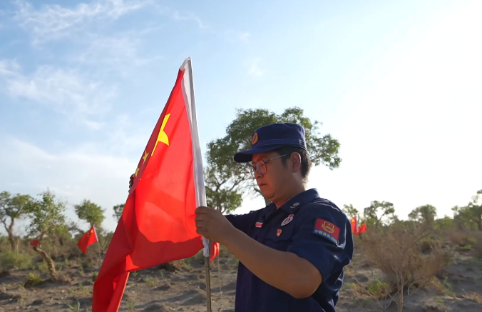 图5 正在“种”国旗的森林消防员——祖卡尔·艾比布(李小虎 摄)
