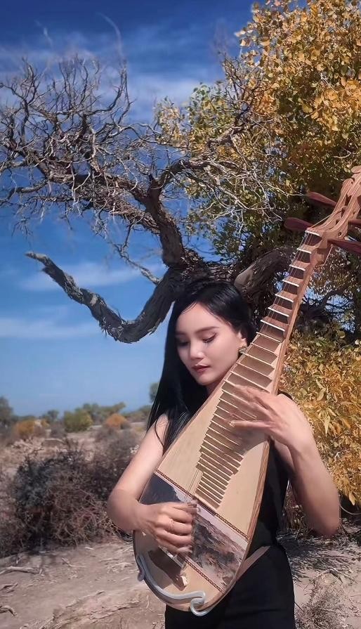 图10 “琵琶李阳“正在伊吾胡杨林间演奏琵琶(达人供图)