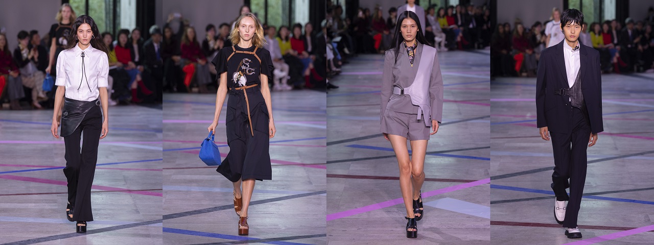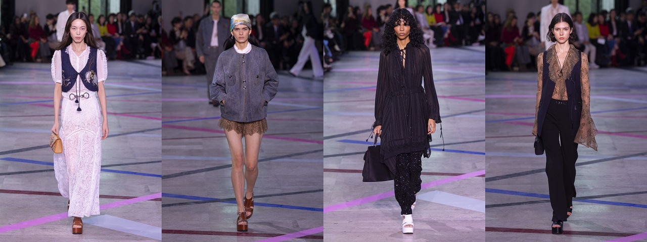 本季服装以马的优雅与速度呼应 70 年代嬉皮的浪漫叛逆,成为灵感核心。色彩以菸草棕、咖啡色、马鞭草蓝紫、黑白为主调,交织亮玫红、钴蓝、民俗石色,既映照日光下嬉皮的洒脱漫游,也折射夜幕disco舞池的电光闪烁。轮廓语汇环绕束口与喇叭线条:女装以大喇叭裤搭配背心,或蕾丝上衣搭配软料下身,呈现「长加长」的慵懒气息;软料套装营造松弛却不失挺拔的气质;男装延伸洞洞装、粗针织背心、五分马裤、皮裤、流苏拼接、工装裤及短外套,搭配大喇叭裤。材质与工艺延续嬉皮手作精神,注入十字绣与缎带绣细节;雪纱、蕾丝与斜纹棉麻印花随步伐摇曳;马鞍曲线幻化为口袋结构,蕾丝短裤勾勒轻盈律动。造型以混搭展现自由精神:古董衣与喇叭裤、手勾针织比基尼与西装的碰撞,流苏与牛仔、睡衣与正装,在冲突中交织和谐。从白日嬉皮的诗意倦态,到 Studio 54 镜球下的迷幻光影,本季以柔中带刚的语言,书写女性多重姿态,凝聚「当代东方视角下的自由灵魂」。