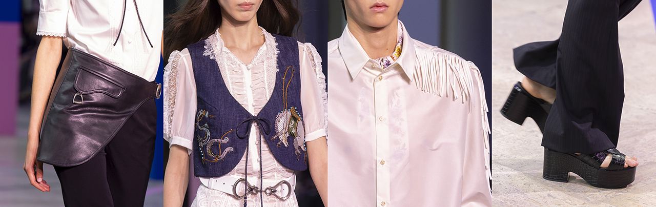 配件延续马术精神,同时融入嬉皮风格:绑带式三角丝巾变换为头巾、领巾与包饰,流露 70 年代的感性风华;马鞍专属的圆弧线条运用于包型轮廓,结合金属挂扣与层叠结构,展现立体层次感;皮质选用绒毛磨皮、头层磨皮及荔枝花纹,型塑自然随性。饰品灵感取自马衔与马蹄铁,幻化为耳环、项鍊、领针与腰带,细节间点亮主题符码。鞋款推出变形玛丽珍鞋、厚底凉鞋与 Brogue 鞋款,搭配冲孔工艺与金属马蹄铁造型釦件。