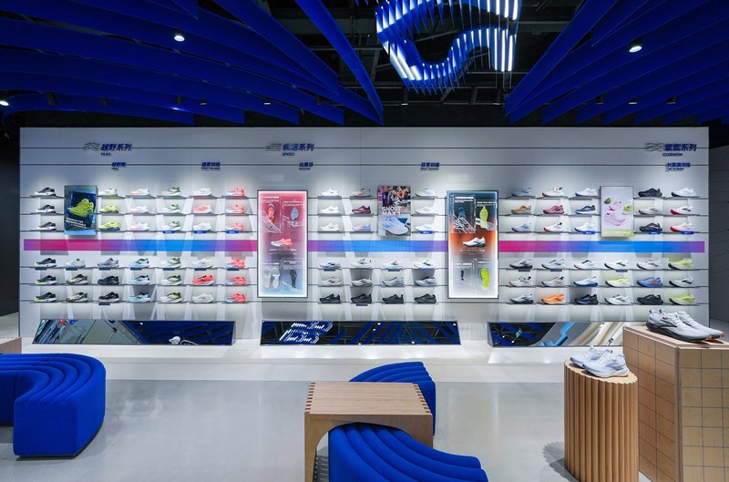 BROOKS北京全新店铺将赛道元素和竞速氛围感巧妙融合——贯穿地面的田径赛道纹理、勾勒奔跑动感的流线型天花板,不仅无缝链接各个产品陈列区域,更带给跑者置身田径场的沉浸式体验;抽象的跑步进程在这里被赋予实体形态,与零售空间精妙融合,每一处细节都在诉说速度的张力、科技的温度与运动的本真,三者交织成独属于BROOKS的空间语言,使之不仅是零售空间,更是跑者社群的集结地与产品科技的叙事场。