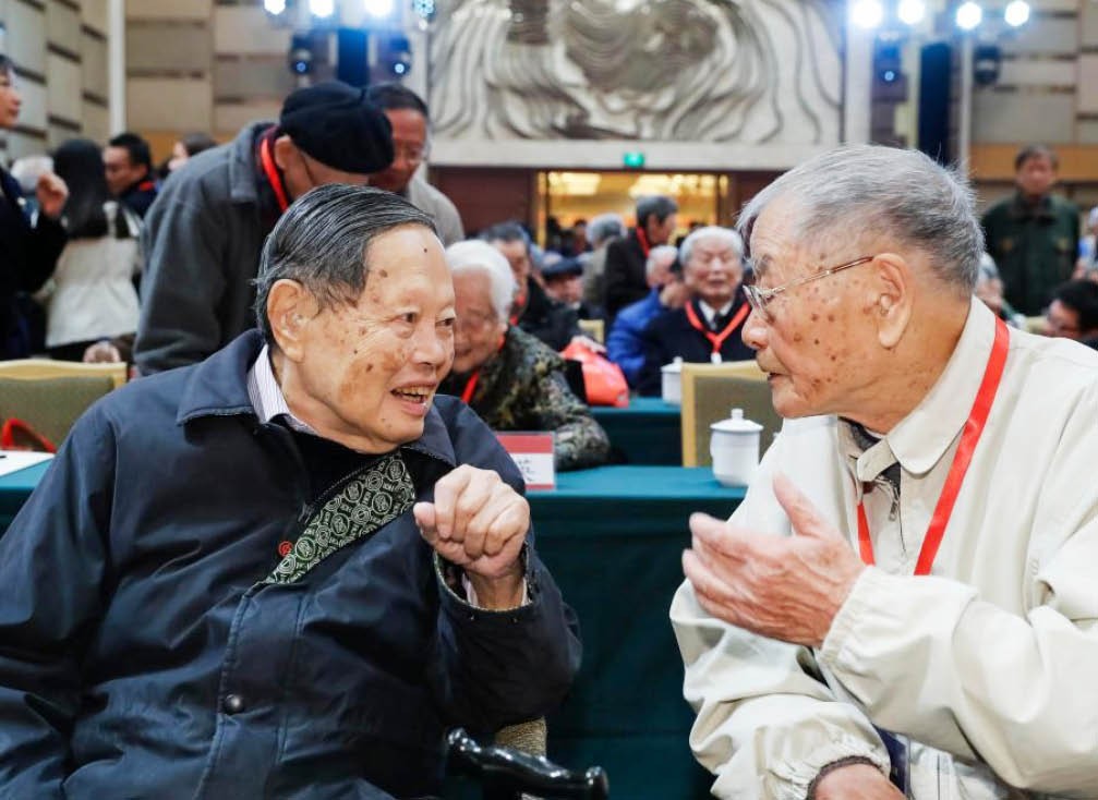 2017年11月1日,西南联合大学建校80周年纪念大会在北京大学举行,杨振宁(左)与西南联大校友吴大昌交流。