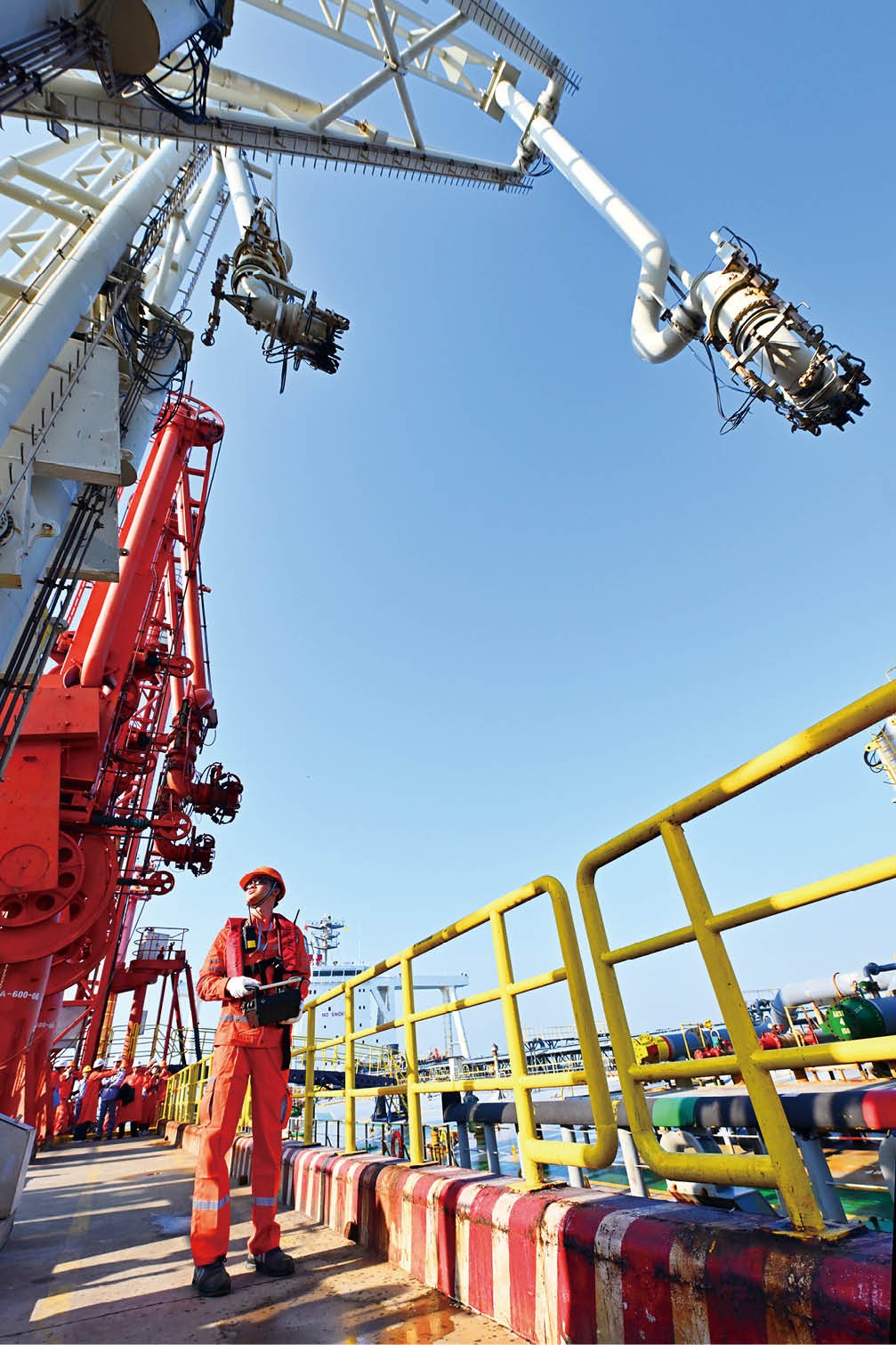 12月18日,装载着石化原辅料的船舶抵达洋浦港后,国投洋浦油储码头工作人员进行卸油作业。