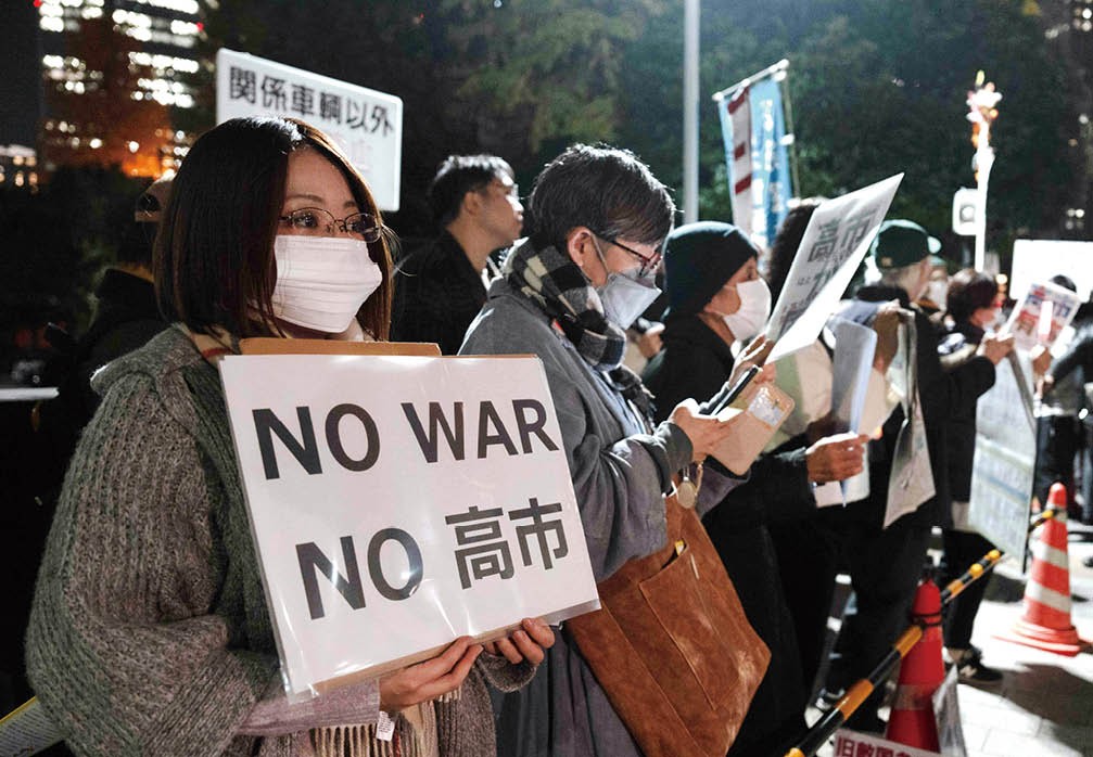 2025年11月21日,在日本东京的首相官邸外,民众手持标语参加抗议活动,要求日本首相高市早苗撤回错误言论。