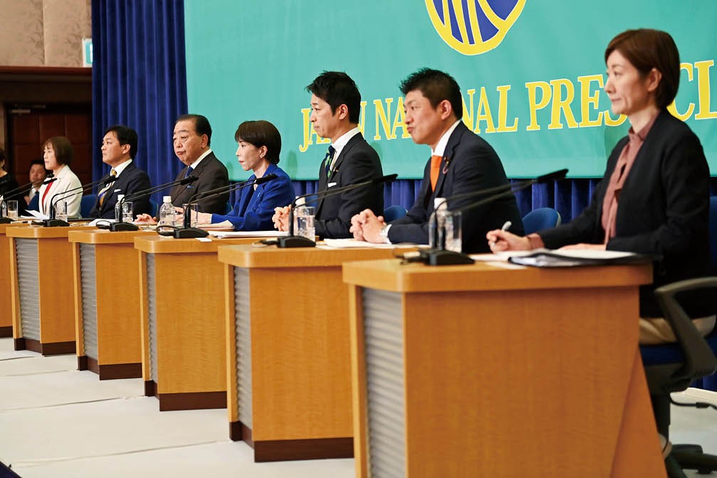 1月26日 ,在日本东京,日本首相、执政党自民党总裁高市早苗(左四)在党首辩论会上发言。
