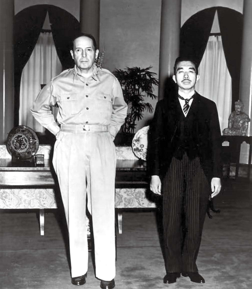 1945年9月27日,作为战败一方,日本天皇裕仁(右)来到东京的美国大使馆拜会麦克阿瑟上将。