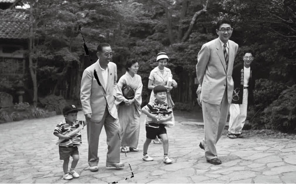 1957年7月7日,日本箱根,日本前首相岸信介(左二)牵着他的外孙安倍晋三(左一)与妻子凉子(左三),还有女婿安倍晋太郎(右二)、女儿安倍洋子(右三),孙子宽信在一起。