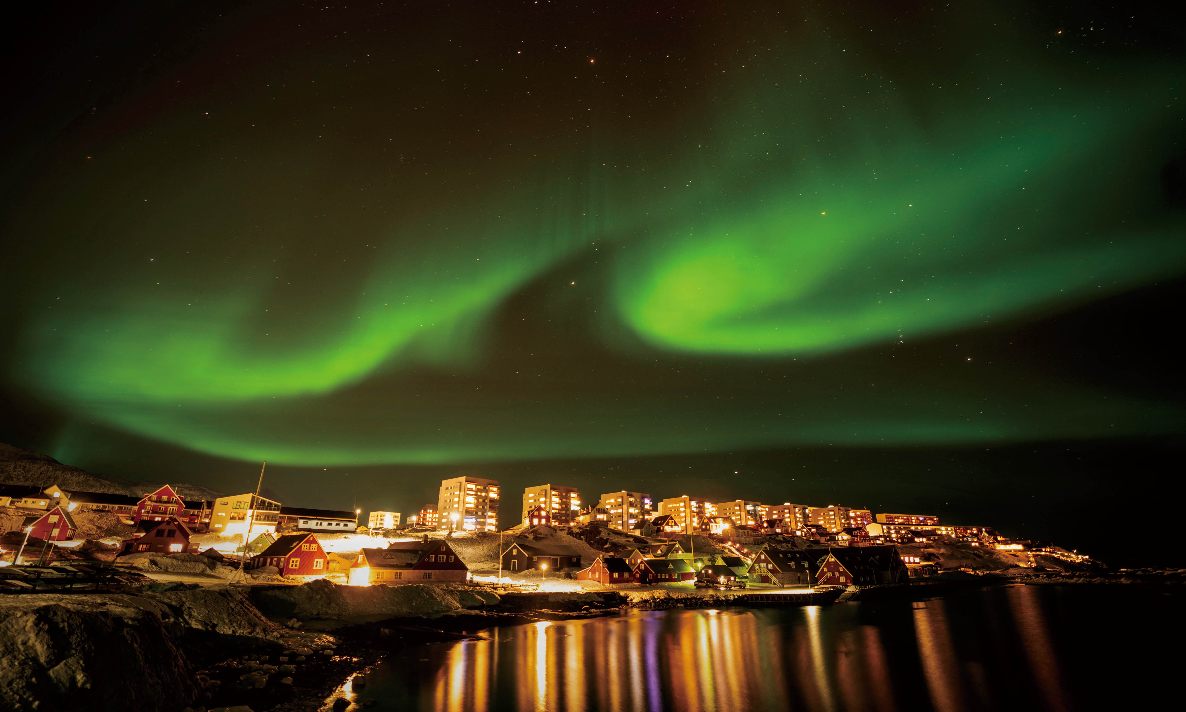 在丹麦自治领地格陵兰岛首府努克拍摄的北极光。