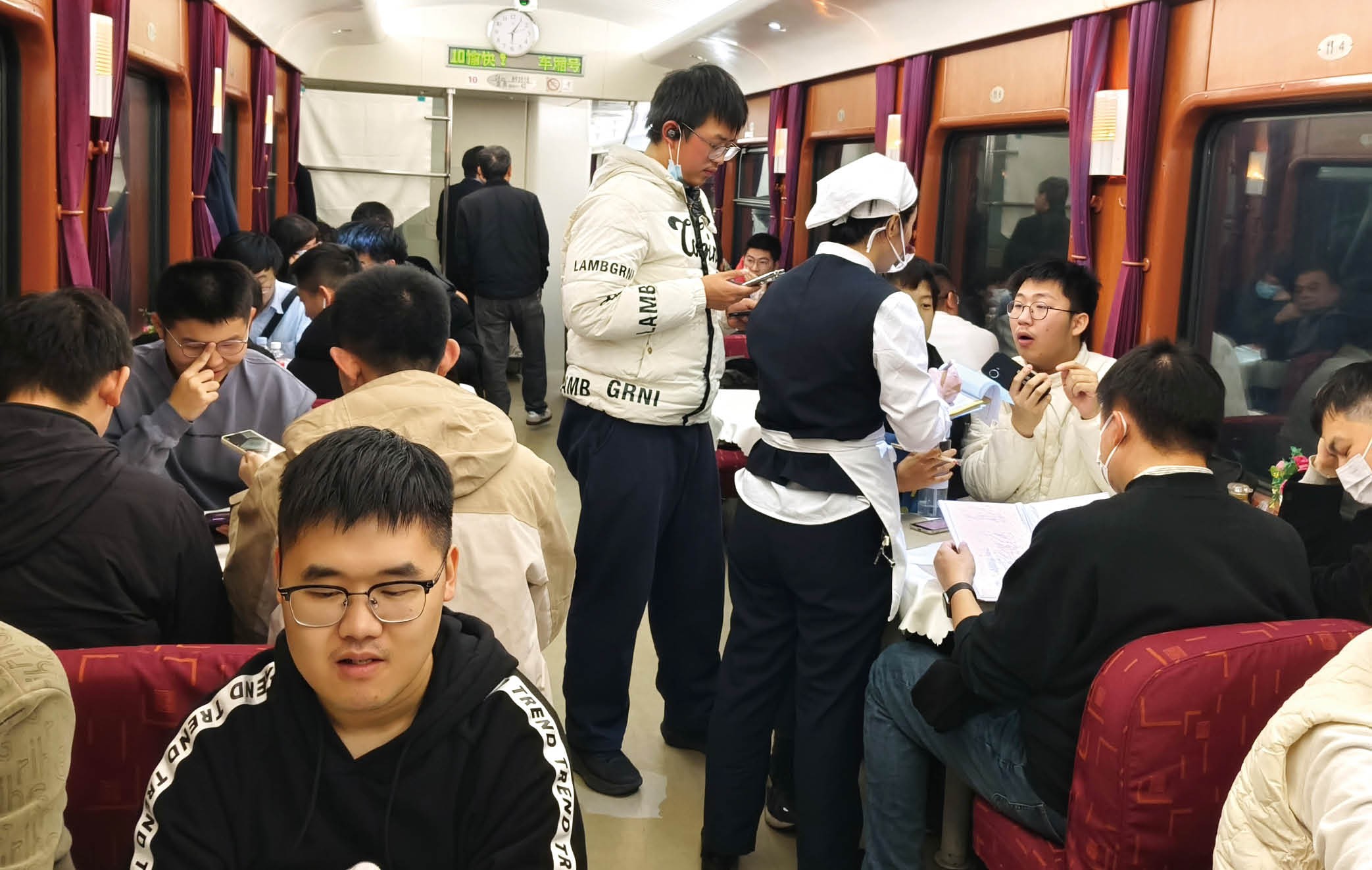 2025年12月27日晚,宋来阳在Z99次列车餐车,和其他火车迷拼桌用餐。受访者供图