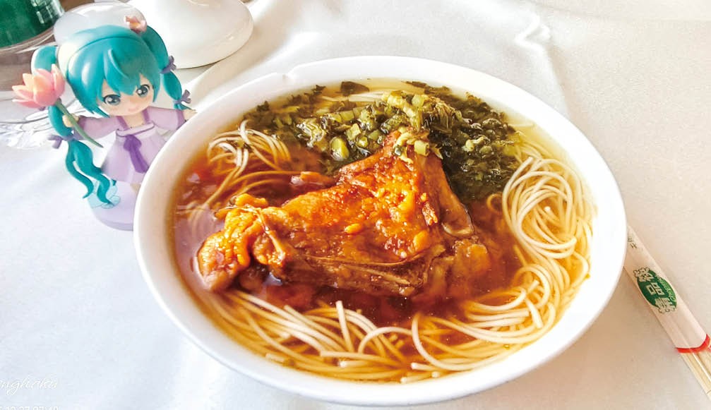 2025年12月27日早晨,宋来阳在Z100次列车餐车,品尝了美味的雪菜大排面。受访者供图