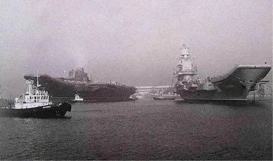 上图:当年在黑海之滨的未完工的“瓦良格”号(左)和“库兹涅佐夫海军上将”号。