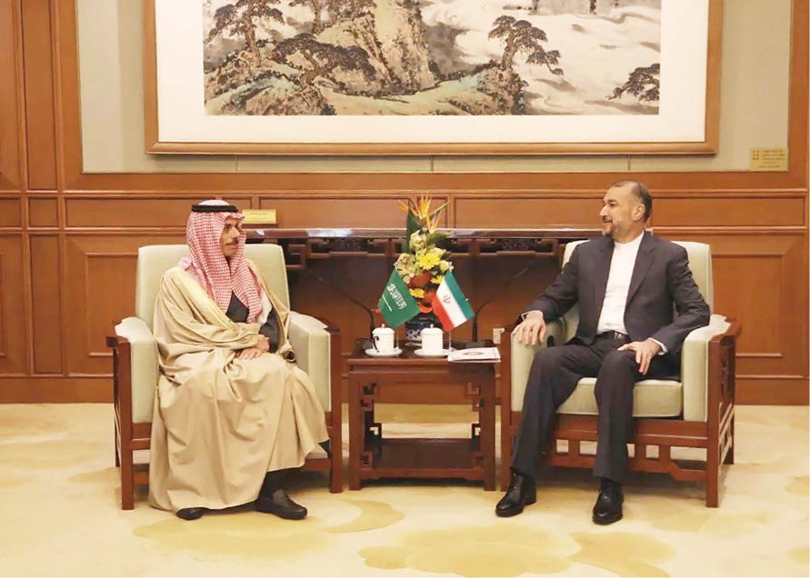 下图:2023年4月6日,沙特外交大臣费萨尔和伊朗外交部长阿卜杜拉希扬在北京会晤,这是两国外长7年多来首次正式会晤。