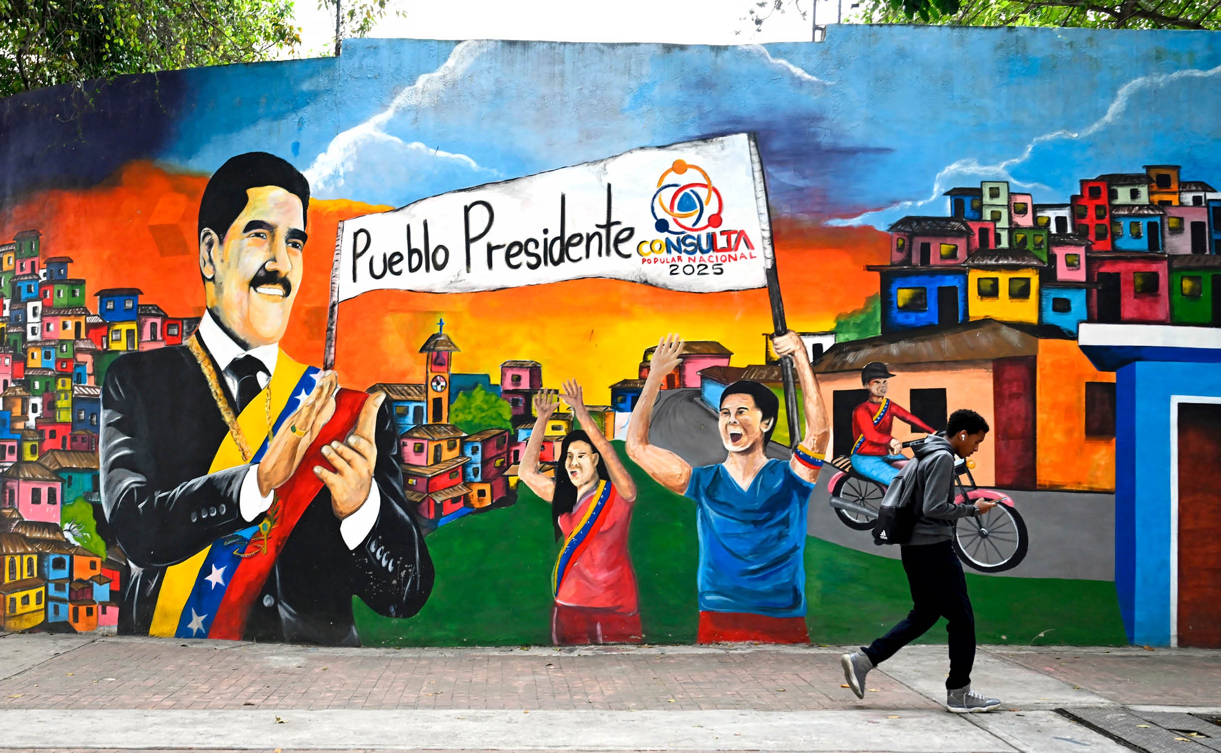 上图:面对美军压境,12月2日,在委内瑞拉首都加拉加斯,行人从支持委内瑞拉总统马杜罗的涂鸦墙前走过。