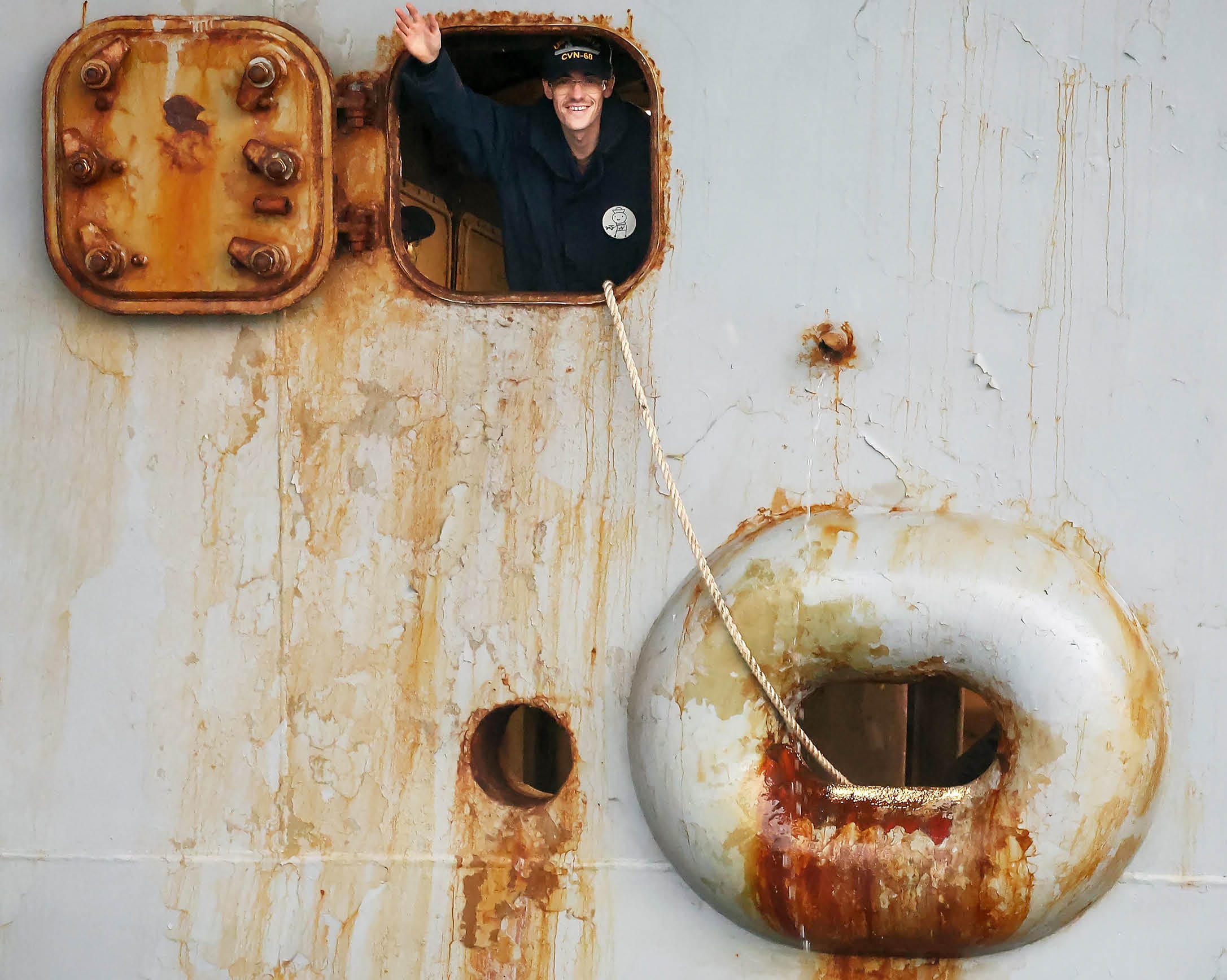 上图:12月16日,美军“尼米兹”号航空母舰驶入基察普海军基地时,一名水手从舷窗向码头上的人群挥手致意。有消息称,“尼米兹”号即将退役。