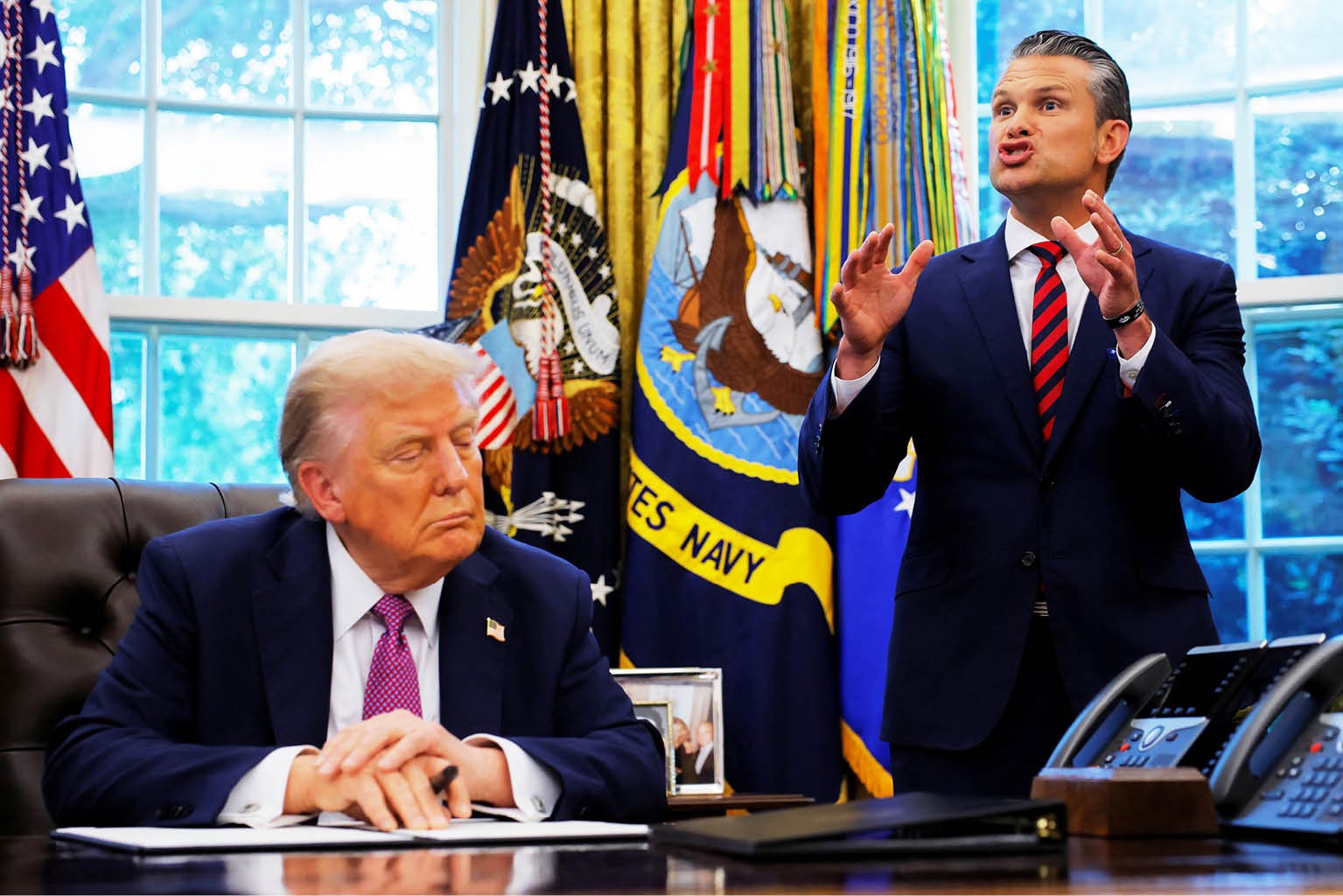 上图: 9月5日,在美国华盛顿白宫,美国国防部长赫格塞思(右)与媒体交谈。 美国总统特朗普(左)当日签署一项行政令,决定恢复美国国防部历史旧称,将其更名为“战争部”。但美国国会目前尚未通过有关议案。