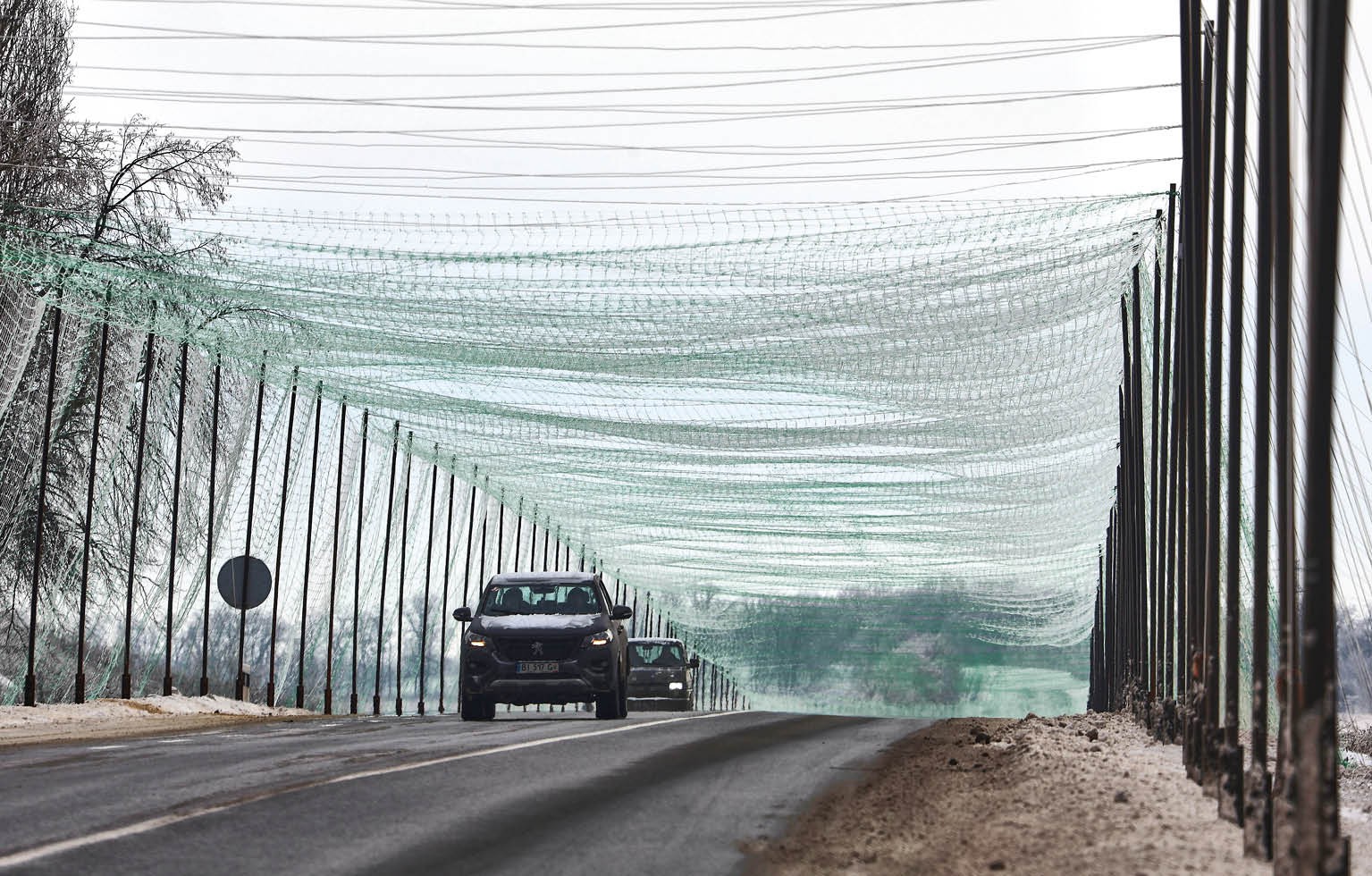 上图:2月2日,乌克兰哈尔科夫州,汽车在覆盖反无人机网的道路上行驶。为防御俄军FPV无人机袭击,当地正在哈尔科夫周边及关键物流路线上架设大型防护网。