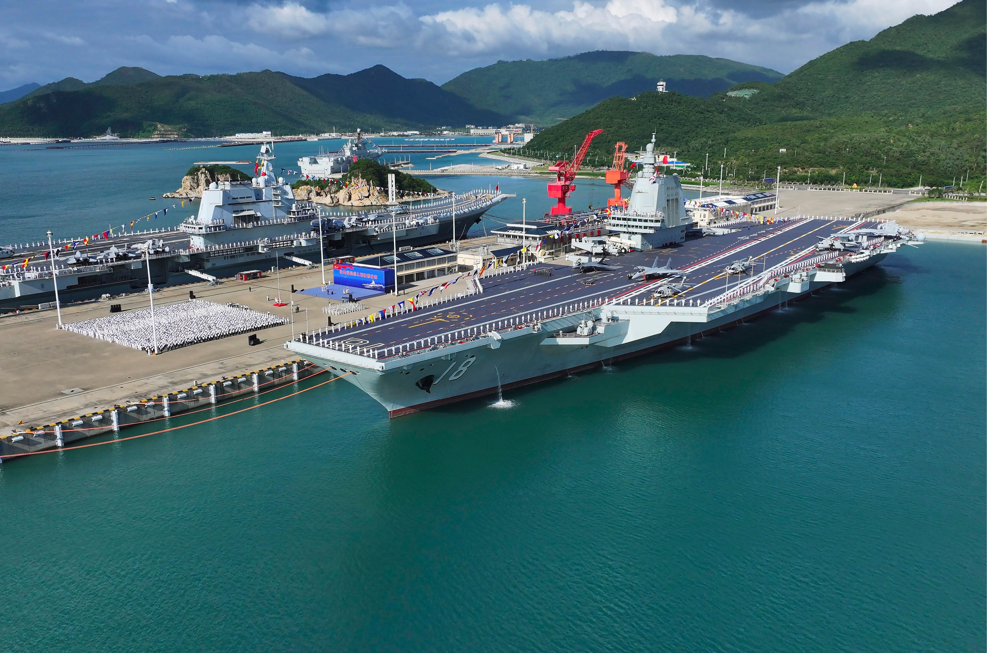 上图:2025年11月5日,我国第一艘电磁弹射型航空母舰福建舰入列授旗仪式在海南三亚某军港举行。