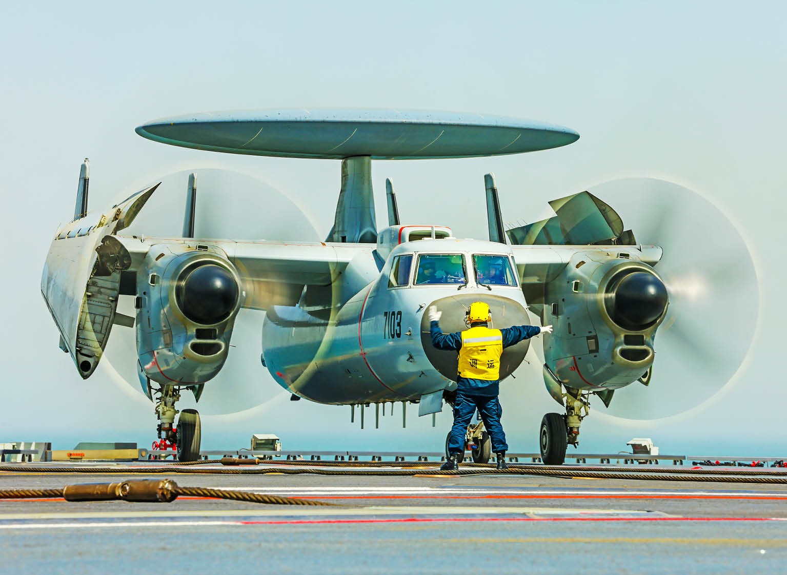 上图:9月22日,福建舰航空保障人员引导空警-600舰载预警机飞行员展开机翼。