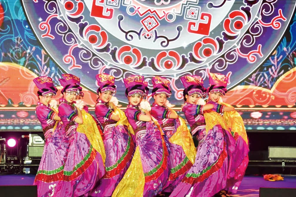 彝族女子群舞《索玛花开·幸福来》在力波九坊上演。