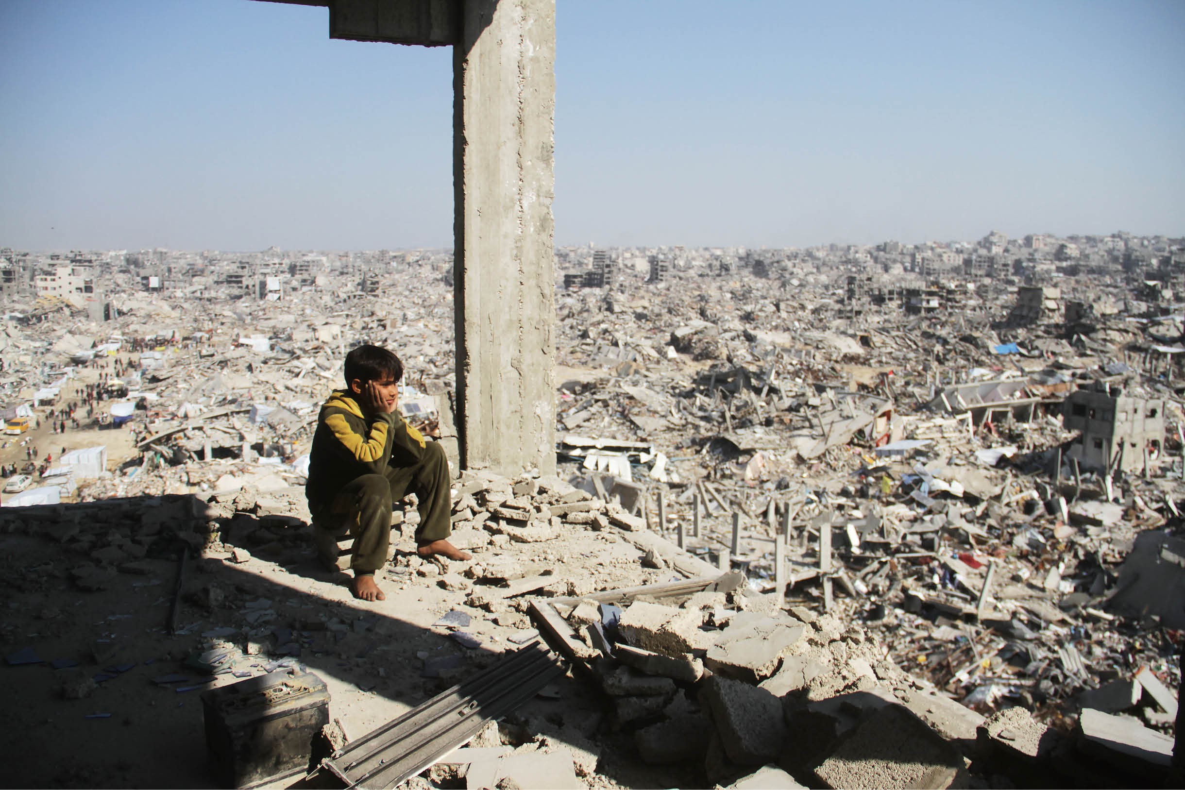 1月29日,在加沙地带杰巴利耶难民营,一名巴勒斯坦少年望向废墟。