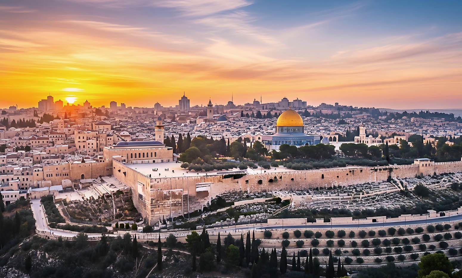 耶路撒冷的金色岩石圆顶被明媚的日落照亮。