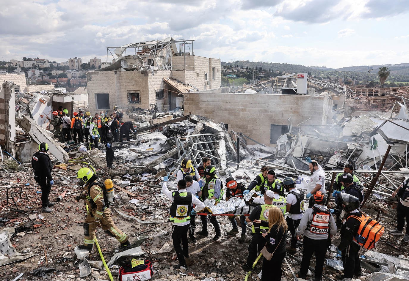 2026年3月1日,以色列贝特谢梅什,以色列急救人员在导弹袭击现场展开搜救。