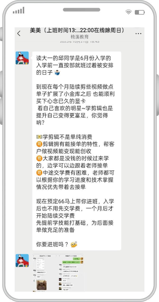 21岁的女生双双(化名)就是这样的受害者。她告诉《新民周刊》,2024年她在第三方求职平台找工作时,被自称“鲸联科技”的机构通过平台邀约面试,公司以“新媒体运营岗位、零经验也能入职、包分配工作”为噱头,承诺“无责底薪6k(专科)/7k(本科)+绩效后月薪过万”“最高薪资一万三四以上”的待遇。