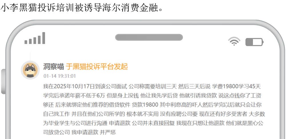 小李黑猫投诉培训被诱导海尔消费金融。