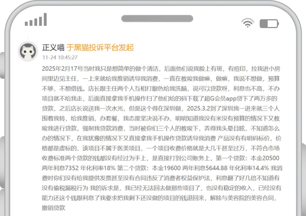 在深圳打零工的小洁刚满20岁,受到网上种种信息的影响,她觉得自己找不到好工作主要是因为长得不够漂亮。2025年2月,她跑去深圳一家名为资医堂的美容院做面部清洁项目。在这里她遇到一位老乡,后者不仅嘘寒问暖,还建议小洁为自己的“美丽事业”多下点本钱。躺在美容床上的小洁脑子一热,掏出手机扫描了老乡提供的二维码,下载了即分期超G会员App,办了20500元的美容贷用于祛痘项目。