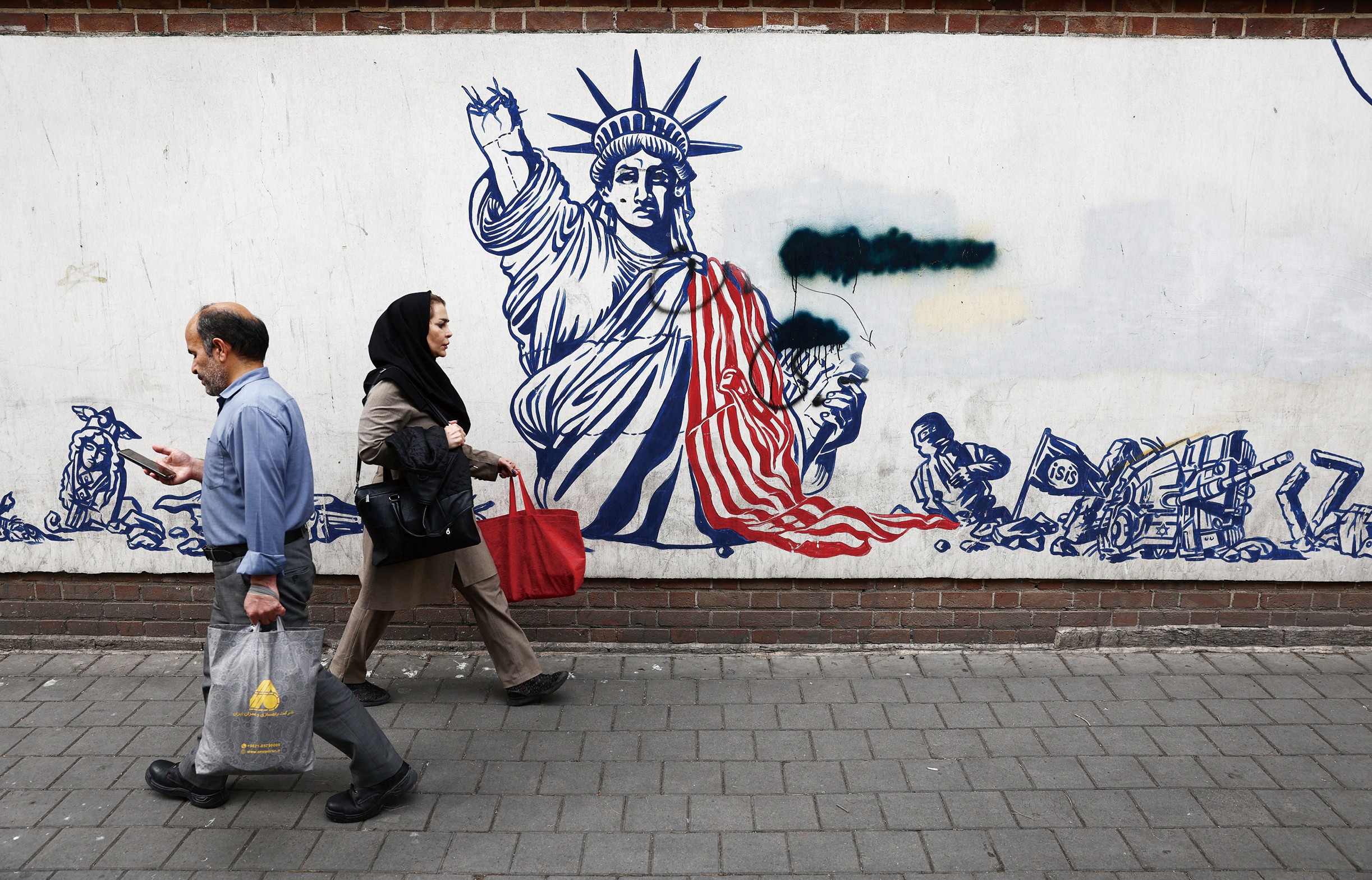 4月20日,伊朗德黑兰,美伊停火两周期间,民众走过街头的反美壁画。