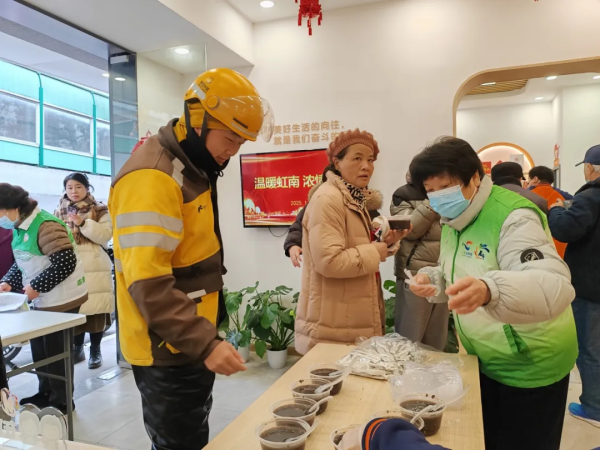 活动现场,江苏路街道社区大食堂还送来了热气腾腾的腊八粥,居民们有序排队领取,一边品尝着美味,一边畅谈着腊八节的传统习俗。此外,居民区工作人员也不忘将腊八粥送到独居老人等特殊群体的家中。一位老年居民感慨地说:“每年腊八节,社区都会举办这样的活动,让我们老年人感受到了社区大家庭的温暖。”